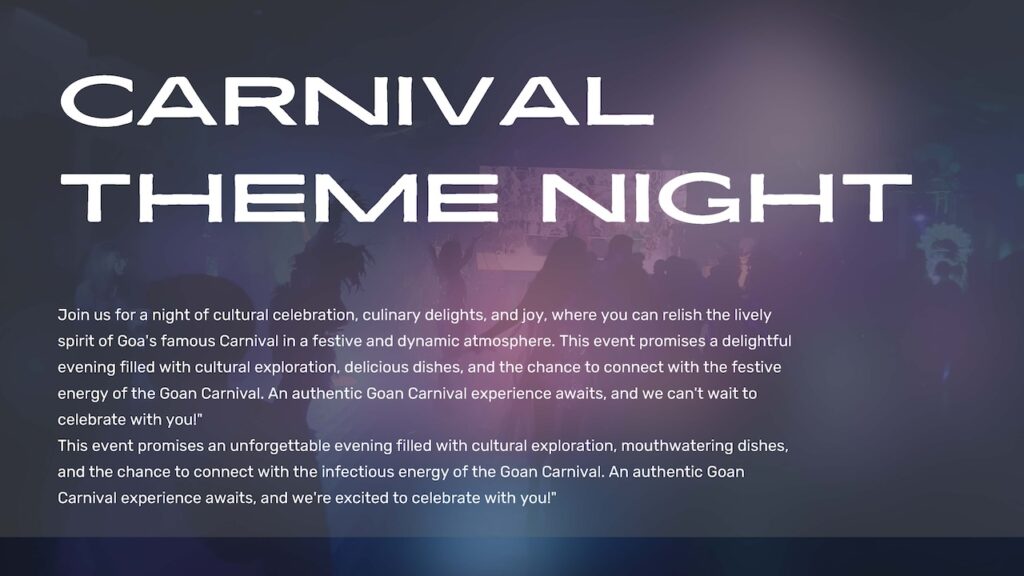 Join us for a night of cultural celebration, culinary delights, and joy, where you can relish the lively spirit of Goa's famous Carnival in a festive and dynamic atmosphere. This event promises a delightful evening filled with cultural exploration, delicious dishes, and the chance to connect with the festive energy of the Goan Carnival. An authentic Goan Carnival experience awaits, and we can't wait to celebrate with you!"